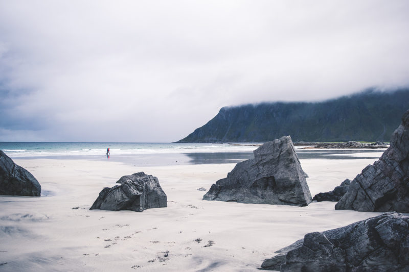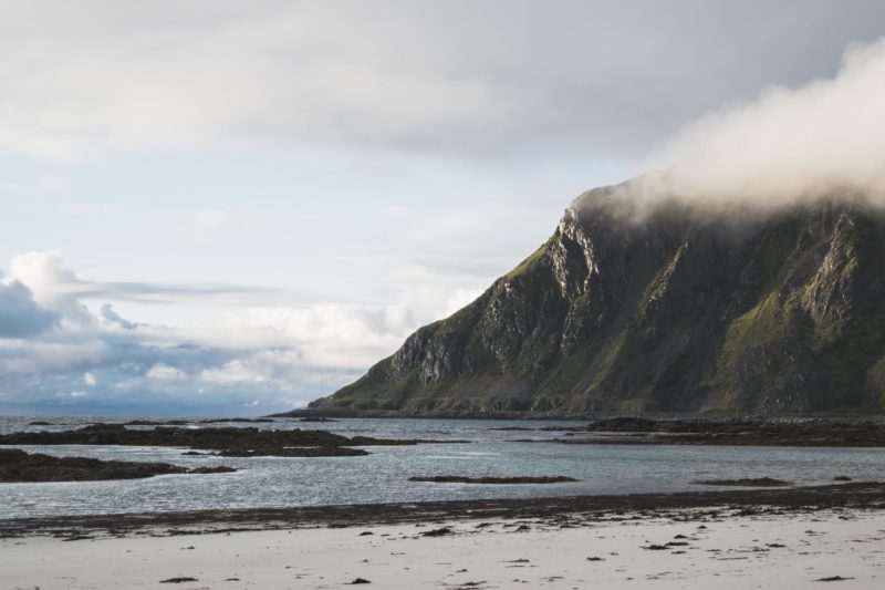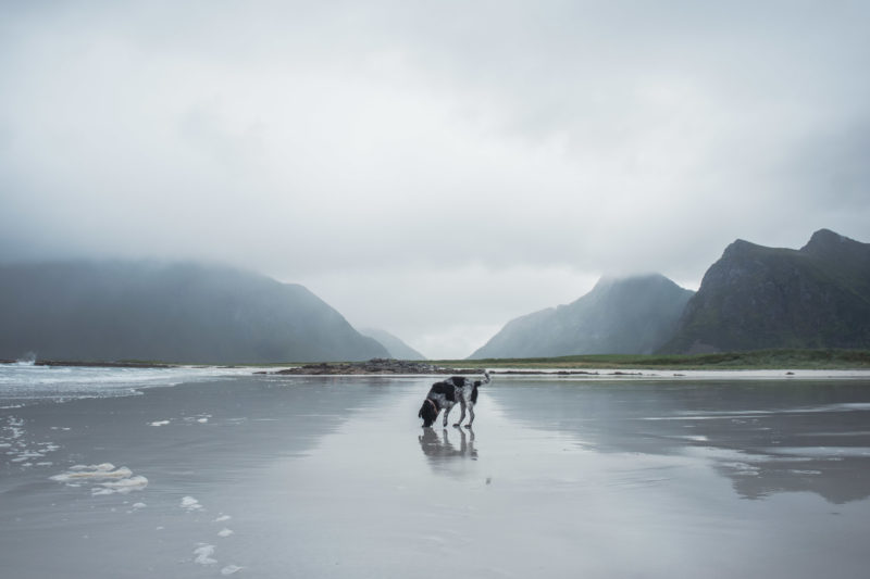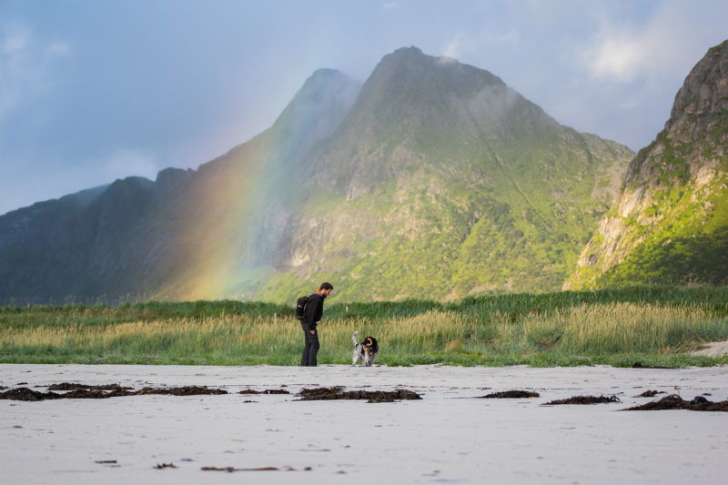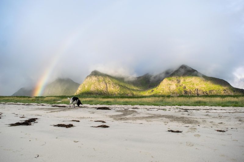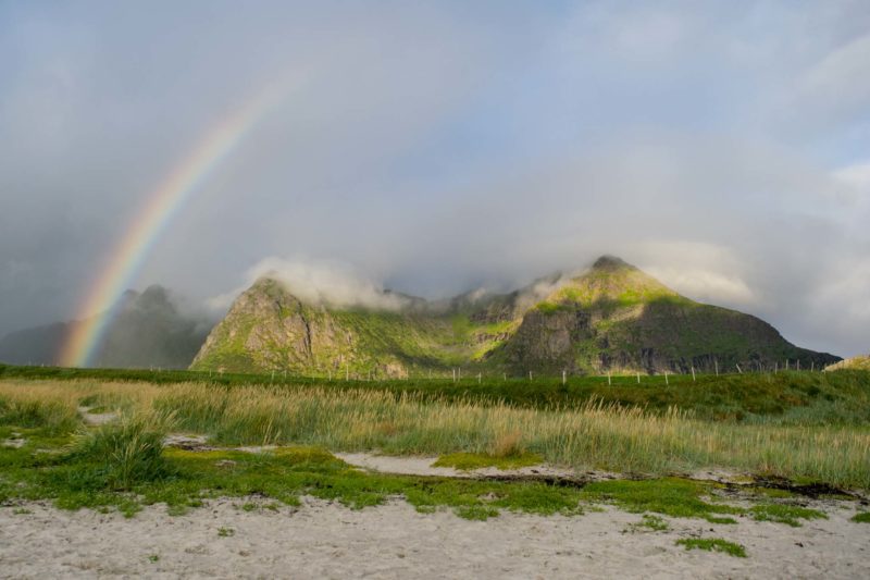 Wenn wir an unsere Zeit in Flakstad denken, dann ist es einfach nur beeindruckend. Schroffe Felsen, tief hängende Wolken und am Abend: Ein Regenbogen!